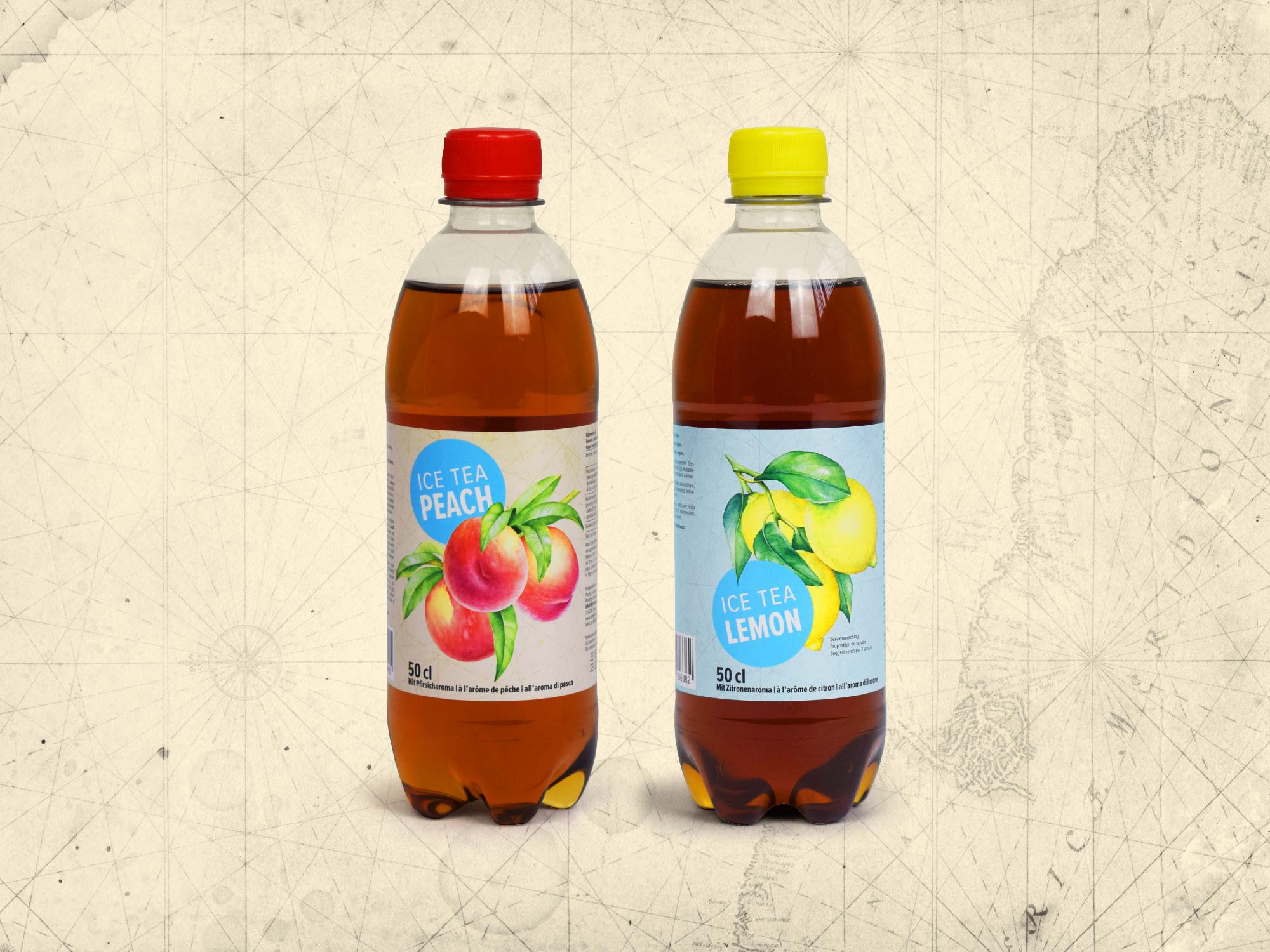 Die Etiketten der beiden Ice Teas, in den Aromen Lemon und Peach, mit überzeugendem Geschmack und dem unschlagbaren Preis, haben wir für Transgourmet kreiert.